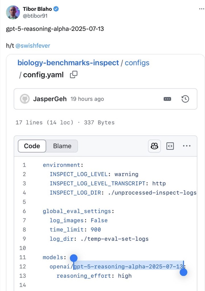 据 Tibor Blaho 表示,在一项生物学基准测试中,出现了一行名为「Models: openai/gpt-5-reasoning-alpha-2025-07-13: reasoning_effort: high」的代码。从这一代码可知,OpenAI 可能已于 7 月 13 日就对 GPT-5 进行定稿,并且该模型或专注于复杂推理任务。