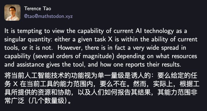 陶哲轩指出,人类很容易将当前 AI 的能力视为一个单一的量化指标,如能够做到某件事情或达不到。但陶哲轩认为,AI 能力有多强应该看能给它多少资源、辅助手段,甚至要观察不同的结果呈现方式,而在不同条件影响了,AI 的能力会差出好几个量级。