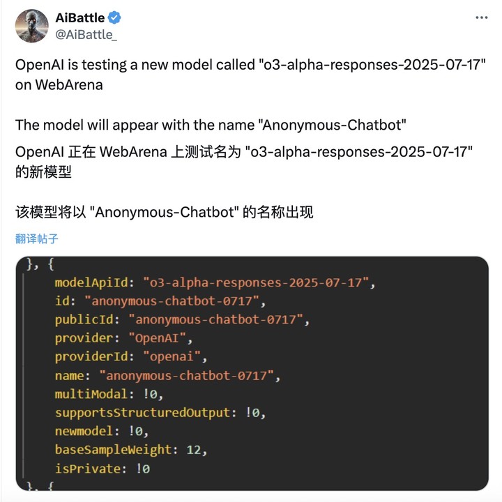 日前,据博主「AiBattle」爆料,OpenAI 正在内部测试名为「o3-alpha-responses-2025-07-17」的新模型。