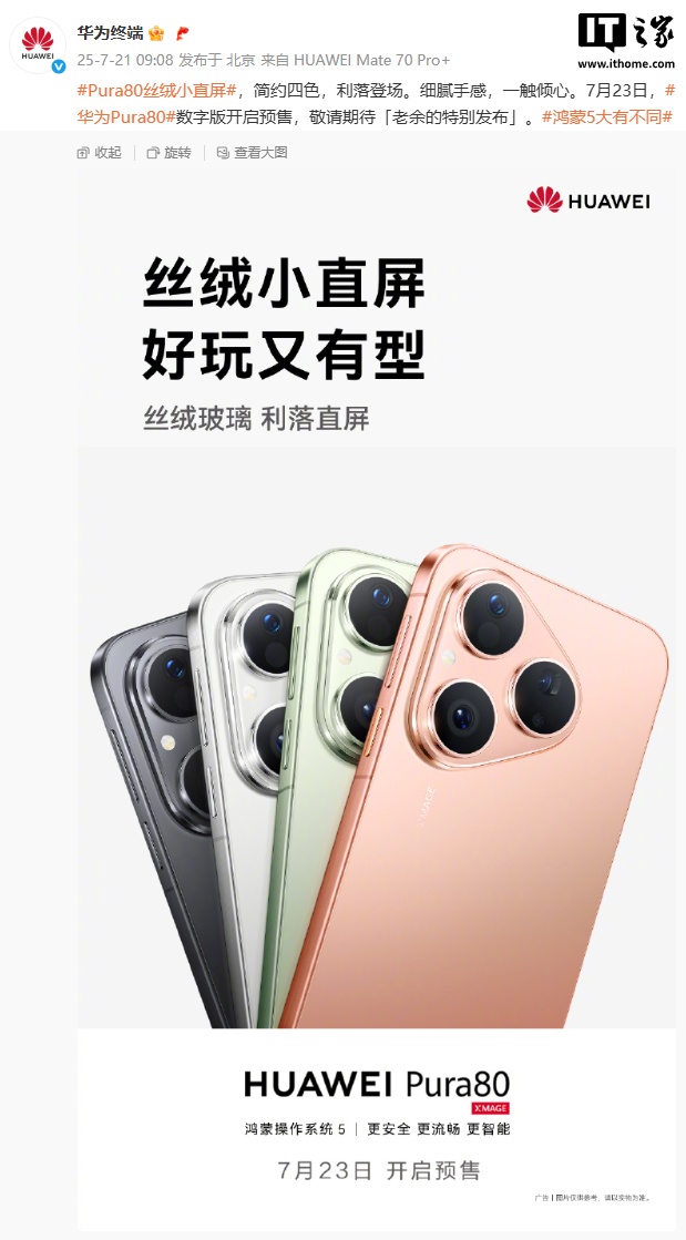 IT之家 7 月 21 日消息,华为今日官宣,Pura80 数字版手机 7 月 23 日开启预售,搭载鸿蒙操作系统 5专业配资门户,敬请期待「老余的特别发布」。